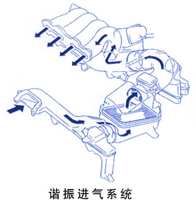 由于进气过程具有间歇性和周期性,致使进气歧管内产生一定幅度的压力波。此压力波以当地声速在进气系统内传播和往复反射。如果利用一定长度和直径的进气歧管与一定容积的谐振室组成谐振进气系统,并使其固有频率与气门的进气周期调谐,那么在特定的转速下,就会在进气门关闭之前,在进气歧管内产生大幅度的压力波,使进气歧管的压力增高,从而增加进气量。这种效应称作进气波动效应。谐振进气系统的优点是没有运动件,工作可靠,成本低。但只能增加特定转速下的进气量和发动机转矩。
