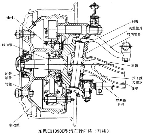 转向桥的结构比转向驱动桥简单,非断开式转向桥主要由前梁、转向节和主销组成。