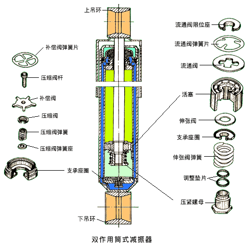 液力减振器的作用原理是:当车架与车桥作往复相对运动时,减振器中的活塞在缸筒内也作往复运动,减振器壳体内的油液便反复地从一个内腔通过一些窄小的孔隙流入另一内腔。孔壁与油液间的摩擦及液体分子内的摩擦便形成对振动的阻尼力,使车身和车架的振动能量转化为热能,被油液和减振器壳体所吸收,并散到大气中。 一、双向作用筒式减振器