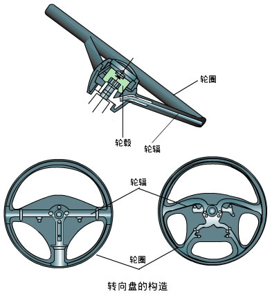 二、转向操纵机构的部件及安全装置 1.转向盘 转向盘由轮缘、轮辐和轮毂组成。转向盘轮毂的细牙内花键与转向轴连接,转向盘上都装有喇叭按钮,有些轿车的转向盘上还装有车速控制开关和安全气囊。