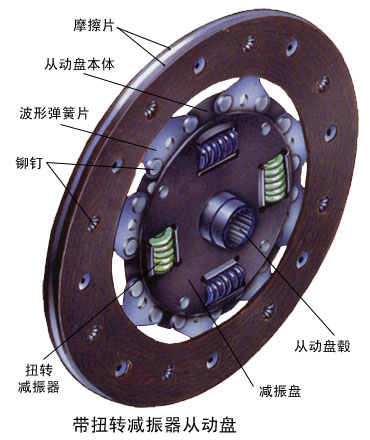 为了避免转动方向的共振,缓和传动系统受到的冲击载荷,大多数汽车都在离合器的从动盘上附装有扭转减震器。扭转减振器主要由减振器弹簧、减振器盘等元件组成。扭转减振器能够降低发动机曲轴与传动系统接合部分的扭转刚度,调谐传动系统的扭振固有频率,使传动系统的共振应力下降。还能缓和汽车改变行驶状态时对传动系统产生的扭转冲击,并改善离合器的接合平顺性。
