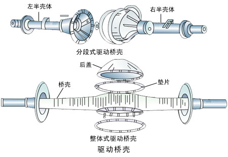 驱动桥壳一般由主减速器壳和半轴套管组成。其内部用来安装主减速器、差速器和半轴等;其外部通过悬架与车架(或车身)相连,两端安装制动底板并连接车轮,承受悬架和车轮传来的各种作用力和力矩。